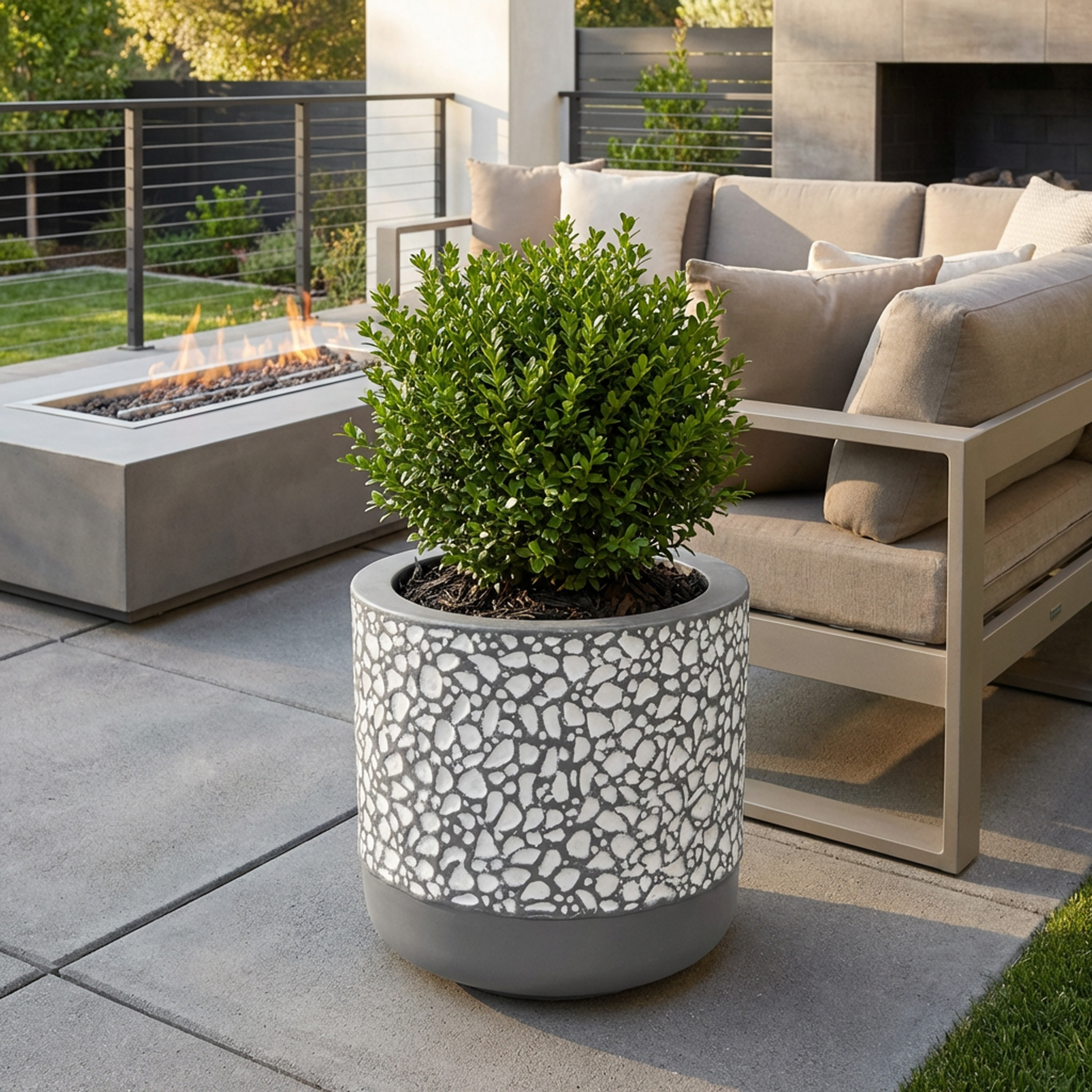 The Burren planter, a modern planter in GRP, beautifully shaped to suit a traditional garden. The planter is completed in a dimpled textured surface to mimic a ceramic finish.
