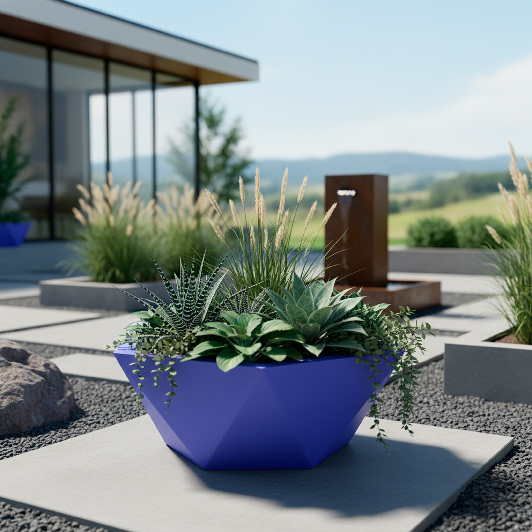Its modern design has a dramatic angular shape which catches the light fabulously and makes for a real feature planter. Therefore, great for a striking feature in a contemporary, modern garden just fill with your favourite plants. Perfect as a standalone statement piece or in a cluster of different shapes and sizes.